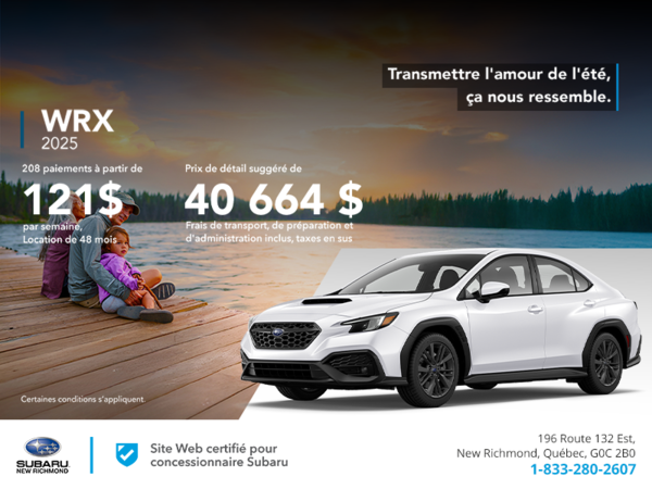 Les offres spéciales sont destinées à vous offrir plus de valeur, et chez Subaru New Richmond, c'est exactement ce que nous visons à faire chaque jour pour nos clients. Nous croyons qu'il est important de donner plus à nos clients à moindre coût, car c'est ainsi que nous pouvons bâtir une clientèle fidèle à long terme qui nous fera confiance pour tous ses besoins.
